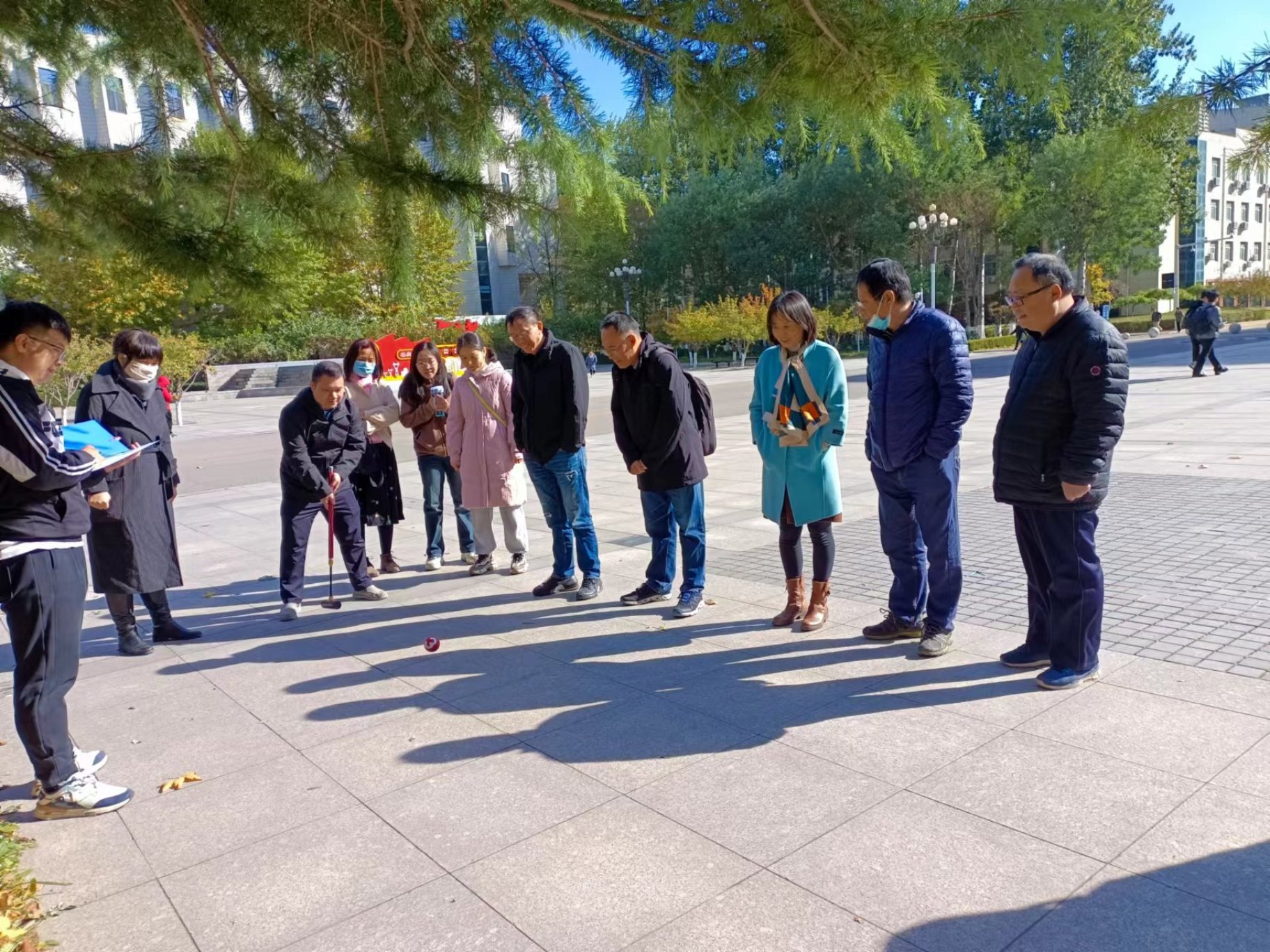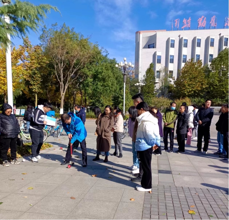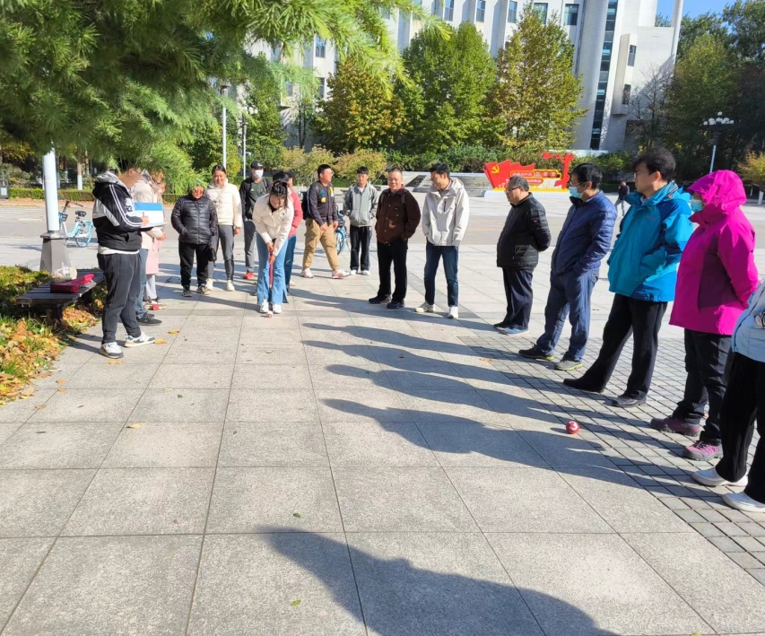 于2023年11月6日在主楼D座东广场举办了门球比赛。门球是高尔夫球与撞球的混血儿,不但规则简单、轻松有趣,而且可以激发脑力、促进身心,是目前时下最经济实惠、老少皆宜的新运动。此活动为参赛者使用门球杆撞击门球,使门球进入规定区域中则获胜。虽然看起来仅是门球杆撞击门球的简单操作,但撞击点、角度和力度都会影响门球的轨迹,非常考验参赛者的技术。