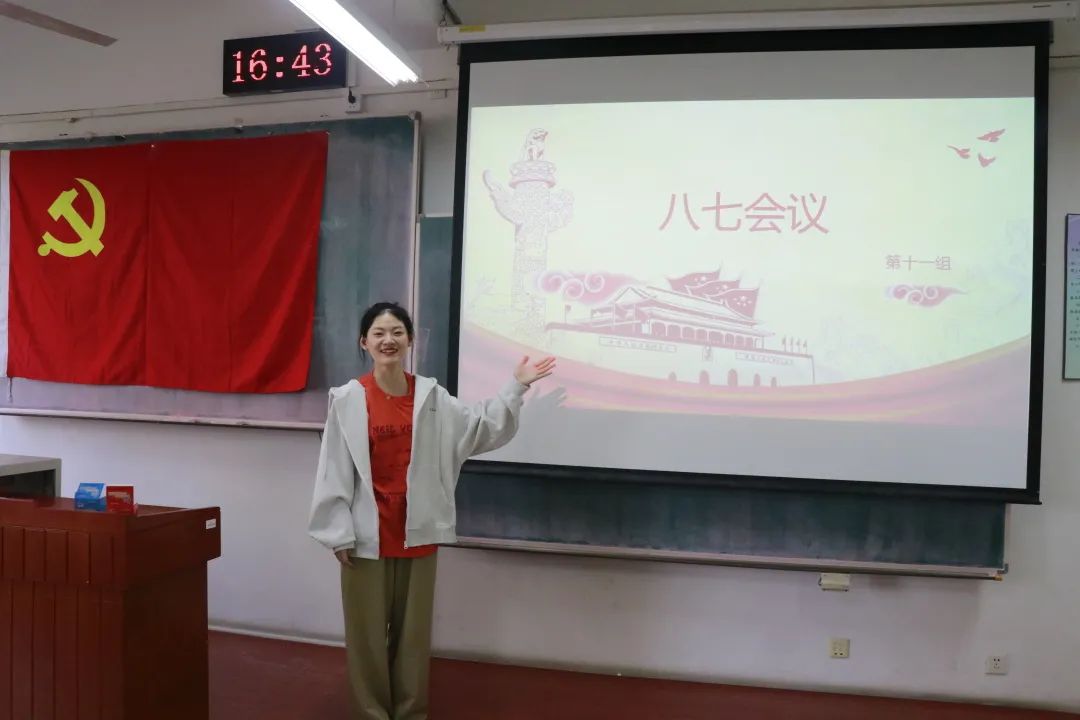第三组的杨皓然和王珺迎同学为大家介绍了有关八七会议的历史背景、会议主题、会议议程及其历史意义。1927年,蒋介石、汪精卫相继发动反革命政变,大革命失败,形势危急。白色恐怖弥漫武汉,笼罩全国。艰难曲折的中国革命走到了十字路口,年轻的中国共产党面临生死存亡。在革命的紧急关头,中共中央改组,陈独秀退出领导岗位,由张国焘、周恩来、李立三、张太雷、李维汉组成中共中央临时政治局常委会。为统一全党思想,临时政治局常委会决定召开中央紧急会议。这次紧急会议在8月7日召开,故又称“八七会议”。八七会议是我党历史上的一个重要转折点,它给正处在思想混乱和组织涣散的中国共产党指明了新的出路,为挽救党和革命做出巨大贡献。八七会议坚决纠正和结束了陈独秀的右倾机会主义错误;改组了中央领导机构;确立了土地革命和武装反抗国民党反动派的方针,决定发动农民举行秋收暴动。八七会议后,中国革命掀开了崭新的篇章!