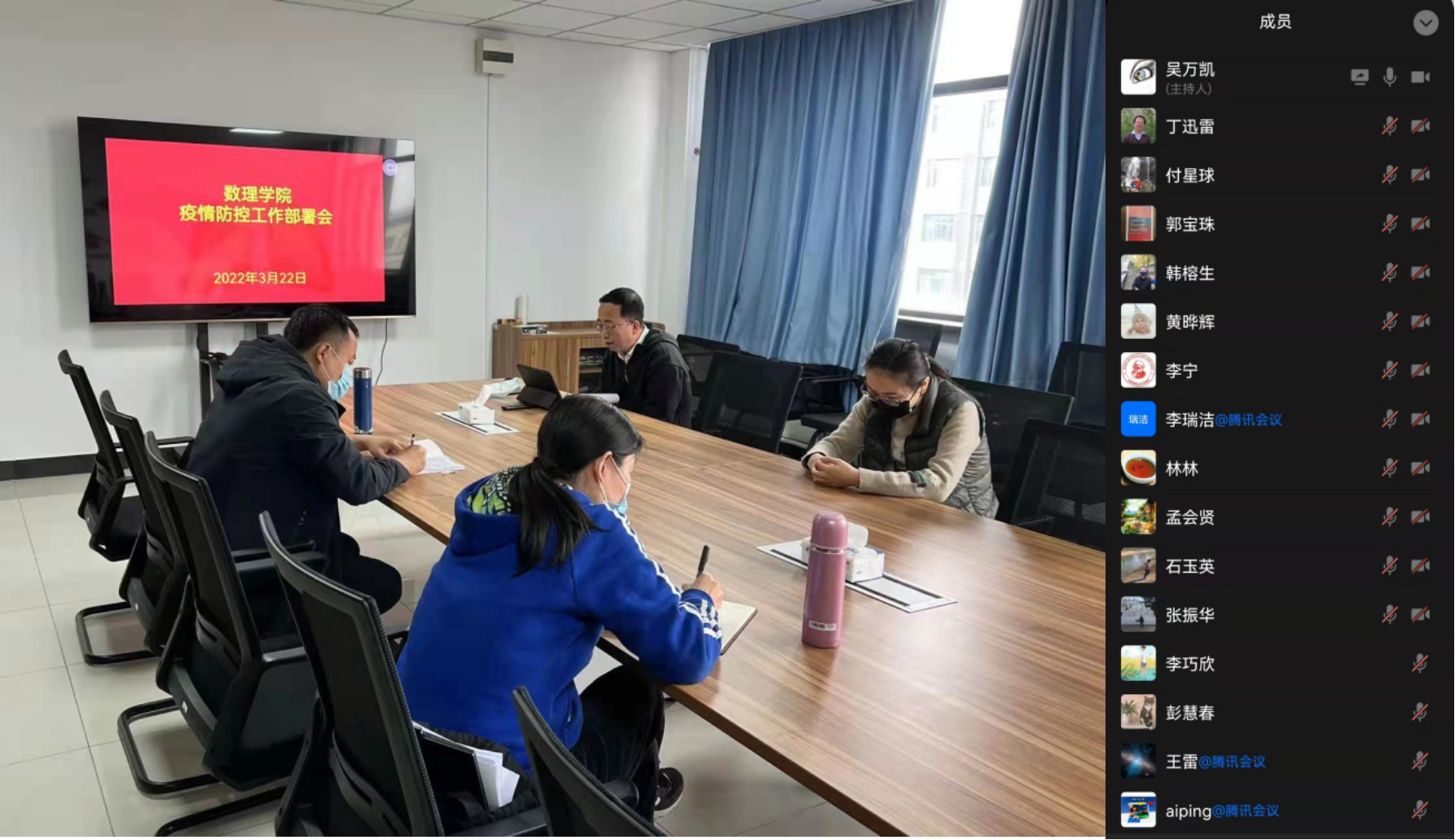 党委召开疫情防控工作部署会,传达贯彻学校疫情防控部署会精神,进一步落实学校疫情防控工作部署。学院全体党委委员、领导班子成员、各教工党支部书记、教研室主任、研究所所长和辅导员通过线上线下相结合的方式参会。院党委书记吴万凯主持会议。